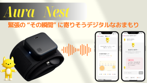 | No.5 九州大学大学院「Aura Nest」 太ももなど⽬⽴たない部位に装着するウェアラブルデバイスが、GSR や⼼拍変動から緊張状態をリアルタイムに検知し、操作不要で振動・温熱による⾝体刺激を⾃動的に与えます。スマートフォンアプリでは緊張発⽣のタイミングをログとして記録・可視化し、緊張への対処と⾃⼰理解を継続的に⽀援する。 |