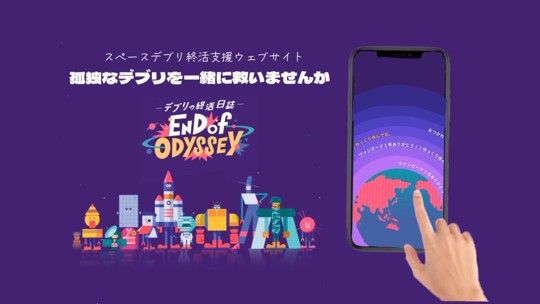 | (サービス概要) 「デブリの終活日誌~END of ODYSSEY~」は役目を終え、宇宙空間を半永久的に周回しているスペースデブリの終活を応援し見守り、デブリ除去を推進することを目標にしたwebサイトです。 |