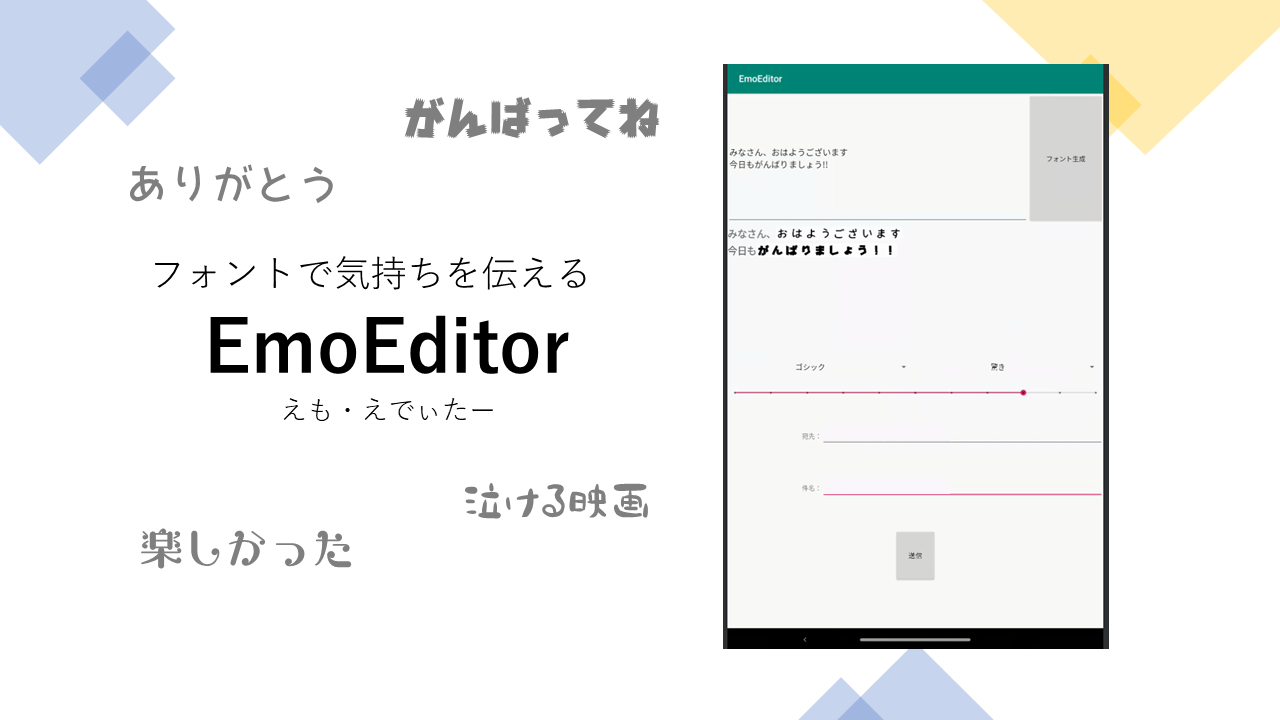 | (サービス概要) 「EmoEditor」は、文字だけでは伝わりにくい感情をフォントで表現して伝えるコミュニケーションツールです。 EmoEditorは、ユーザーに感情豊かなテキストコミュニケーション体験を提供します。 |