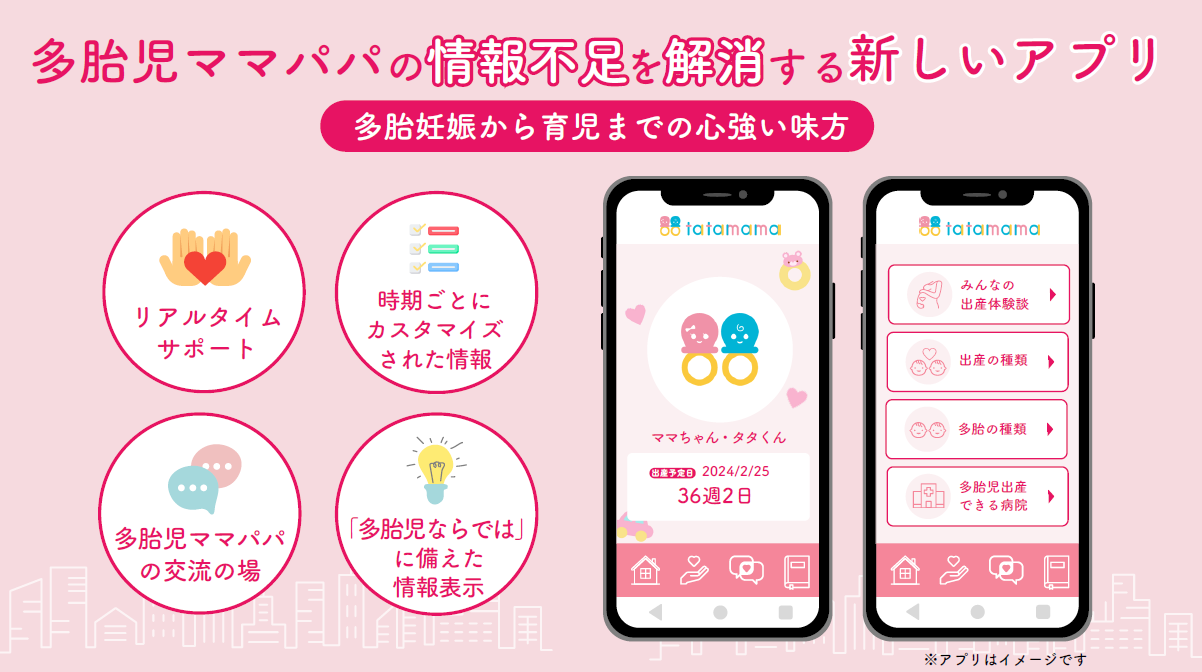 | (サービス概要) 「tatamama」は、多胎に特化した妊娠から出産育児までの情報と専門的知識を発信するアプリです。 情報が少なく孤育てになりやすい多胎における困難を解決します! |