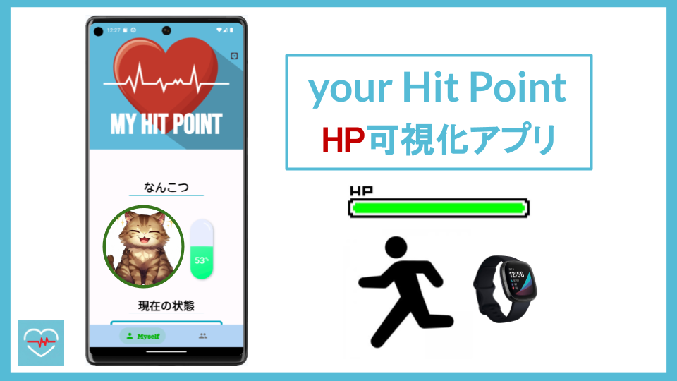 | (サービス概要) HP可視化アプリ「your Hit Point」は、ゲームの「HP」という指標をスマートウォッチから取得できる健康情報から厳密に表現します。HPに応じてペットアバターの体調も変化します。 |